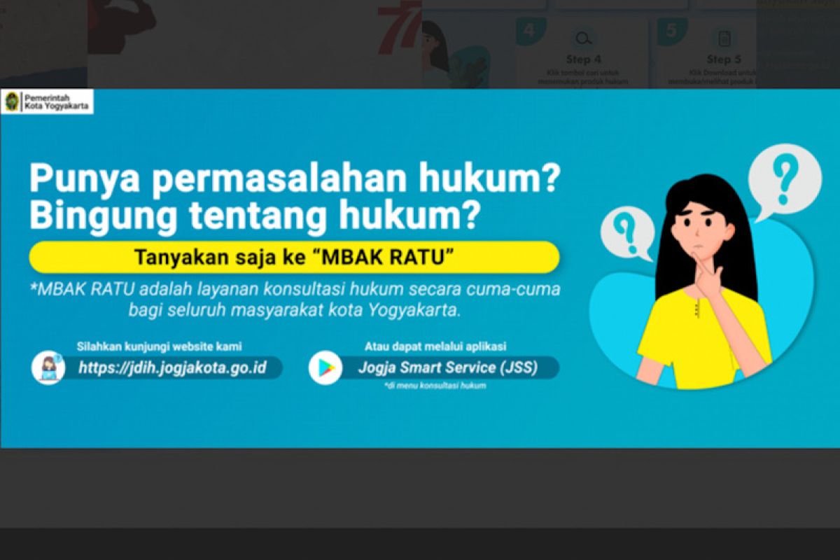 Layanan konsultasi hukum Mbak Ratu saat ini bisa diakses secara daring melalui aplikasi Jogja Smart Service (JSS) atau langsung melalui laman Bagian Hukum Pemerintah Kota Yogyakarta yang beralamat di hukum.jogjakota.go.id.